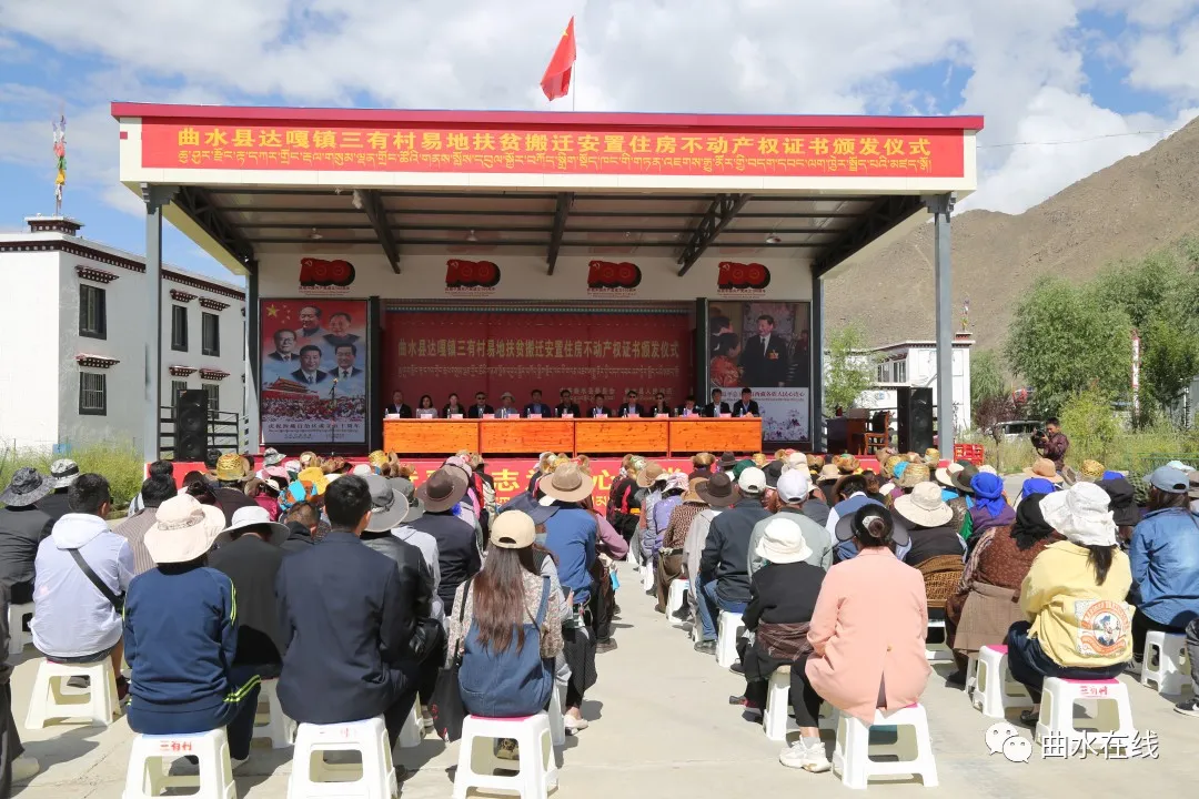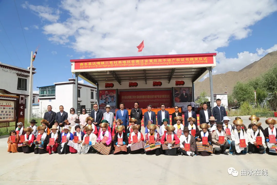 7月12日上午,拉萨市曲水县达嘎镇三有村易地扶贫搬迁安置区的搬迁群众吃了安居乐业的“定心丸”——领到易地扶贫搬迁安置房的不动产权证书。区党委党史学习教育第九巡回指导小组、区自然资源厅、曲水县委、县政府相关领导参加了仪式。
